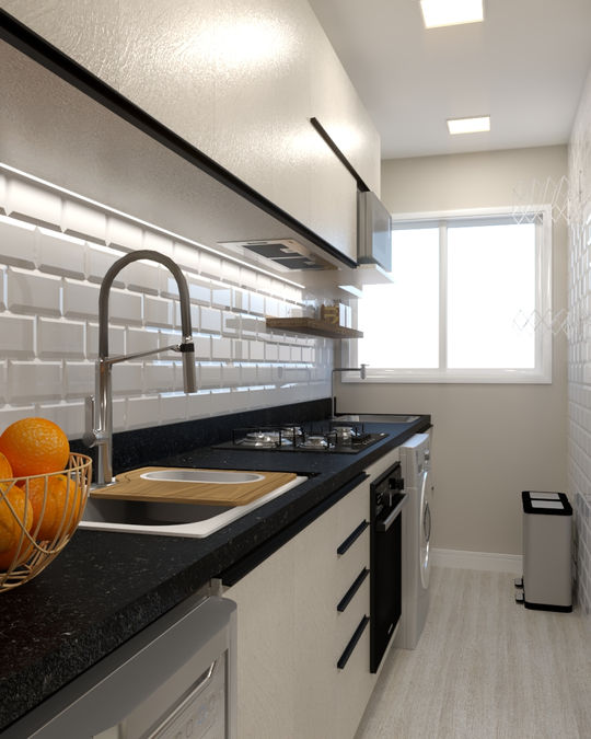 Cor nunca é demais quando bem aplicada e com potencial para renovar e transformar um ambiente. A utilização de cores nesse apartamento teve o objetivo de proporcionar a sensação de ambiente mais compacto e aconchegante. Elas também auxiliaram a setorizar os ambientes, assim como a marcenaria, que nos permitiu setorizar a área do hall de entrada, com espaço para os clientes colocarem seus sapatos. O carrinho de bar é um coringa na decoração. Ele pode servir como espaço de bar ou como mesa de apoio para o sofá. O papel de parede traz a natureza para dentro de casa, aliado com a parede verde da sacada que, com o balanço, garantiu um lugar de descanso super charmoso. O espaço de jantar compacto com banco e cadeiras junto à cristaleira transformou uma parede em ângulo em um móvel com muito aproveitamento de espaço. A cozinha em tons claros ajuda na difusão da luz, otimizando assim a iluminação do ambiente.