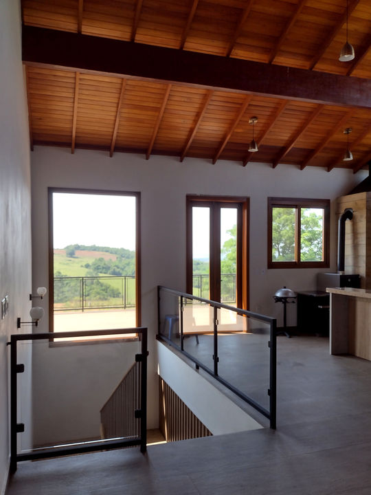 Um lugar mais afastado da área urbana, circundado pela natureza e suas belezas naturais: assim podemos descrever o terreno do projeto para a Casa Passo D'Areia. Com um terreno pré-definido, nossa missão foi aproveitar a localização para projetar uma residência que valorizasse cada visual que a fachada poderia proporcionar. Uma varanda que circundasse a residência foi uma diretriz. Aproveitamos ela para abrigar o acesso, marcado por uma grande porta pivotante que se abre para um espaço totalmente integrado: cozinha, estar e jantar. A escada, envolvida por ripados, propicia a comunicação dos andares, mas com certa discrição, nos levando ao segundo pavimento, no qual encontramos um pé direito duplo e um lindo forro de madeira Garapeira com vigas aparentes. A iluminação natural se faz presente em todos os ambientes, pois era fundamental abrir janelas para a natureza que abraça a casa.